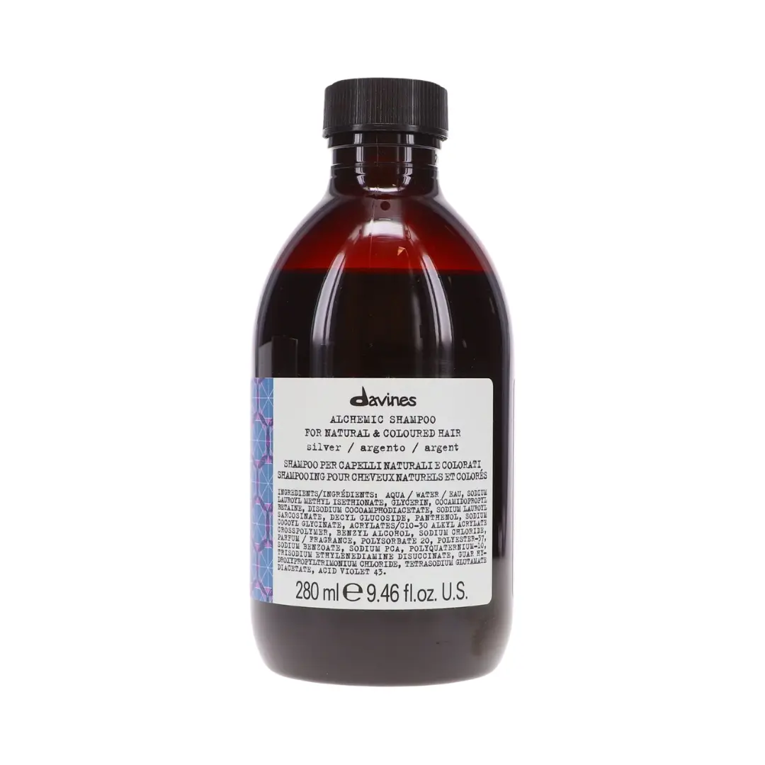 Šampon Davines Alchemic Silver jemně neutralizuje žluté tóny a oživuje studené odstíny vlasů.