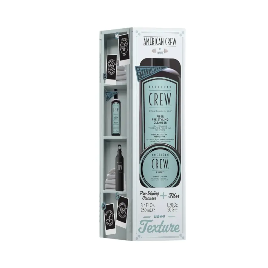 AMERICAN CREW Fiber Duo Gift Set je dárková sada pro muže obsahující šampon Fiber Pre-Styling Cleanser a stylingovou pastu Fiber Classic pro texturovaný účes se silnou fixací.