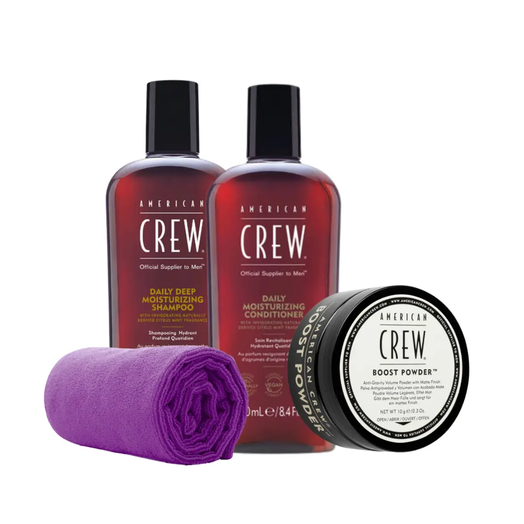 Sada obsahuje: American Crew Daily Deep Moisturizing Shampoo 250ml + American Crew Daily Moisturizing Conditioner 250ml + American Crew Classic Boost Powder 10g + Bifull Ručník z mikrovlákna fialový 1ks