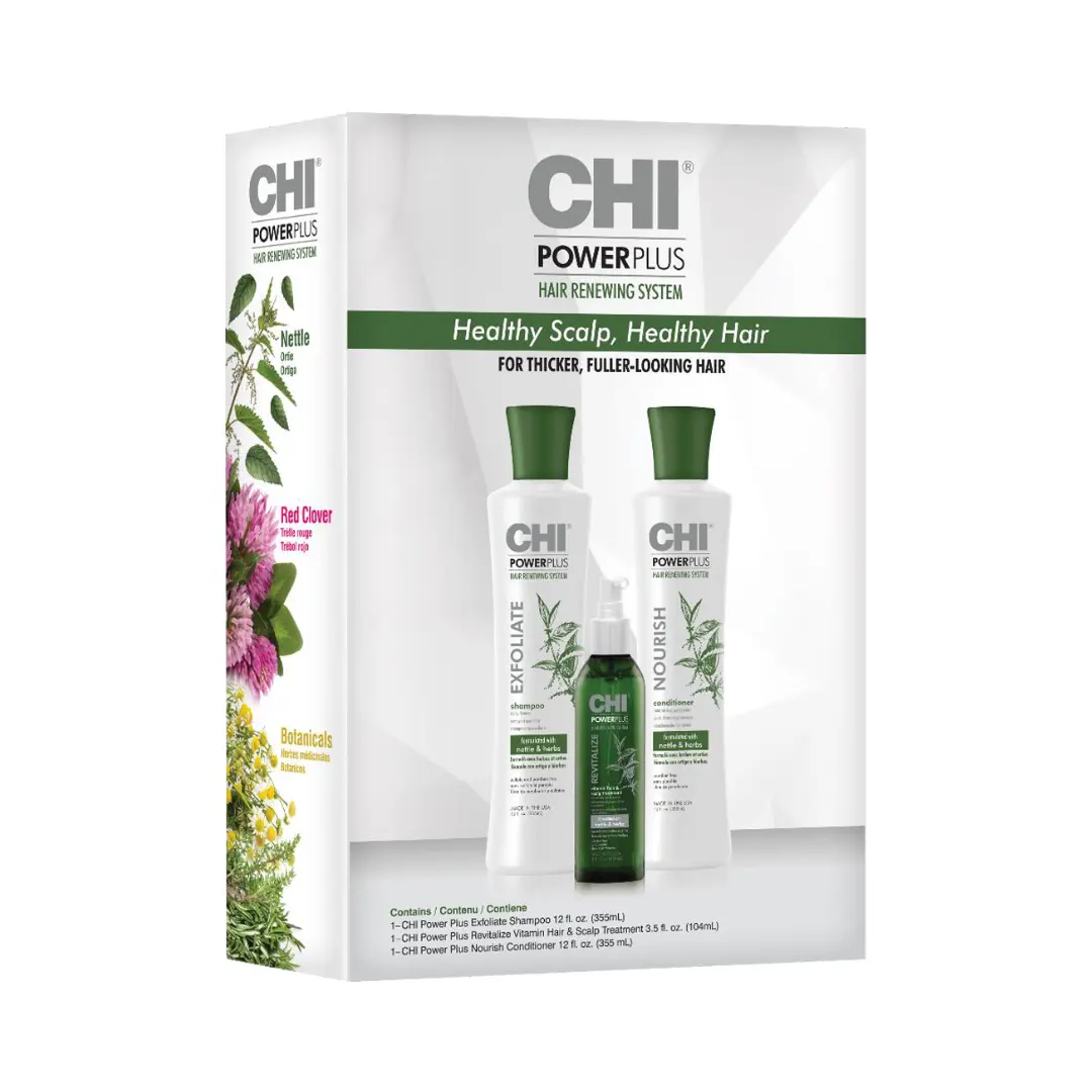 Sada FAROUK CHI PowerPlus On-Going Kit je kompletní péče pro podporu zdravé pokožky hlavy a posílení vlasů.