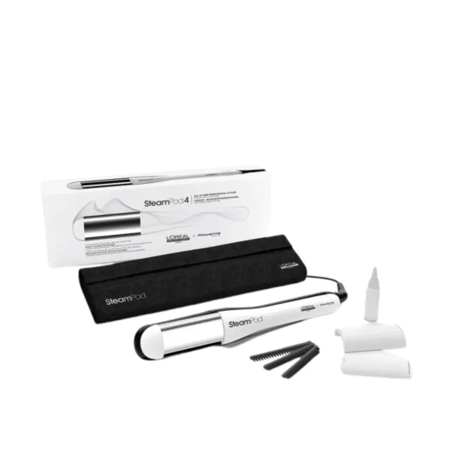 Multifunkční parní žehlička na vlasy Loréal Professionnel SteamPod 4 umožňuje až 3x rychlejší žehlení, 2x uhlazenější výsledek a až od 95 % menší poškození vlasů (ve srovnání se SteamPod 4 bez páry a hřebínku). Díky novému ergonomickému designu se žehlička dostane až o 30 % blíže ke kořínkům vlasů. Extra plovoucí horní žehlicí destička zajišťuje optimální přilnavost ke všem typům vlasů. Žehlicí destičky jsou keramické a jsou potažené vrstvou hliníku, který zvyšuje jejich odolnost a to i v případě intenzivního používání žehličky. Žehlička má teplotní nastavení od 180 °C do 210 °C a je tak vhodná pro všechny typy vlasů. Chytrá regulace teploty kontroluje teplotu destiček až 250x za vteřinu, čímž je zajištěno rovnoměrné zahřátí destiček. Parní technologie rozptyluje až 0,8 g páry za minutu pro viditelně hladší výsledek žehlení a jedno naplnění nádržky na vodu vystačí na vyžehlení až 192 metrů vlasů. Žehlička je také vhodná pro vytváření vlnitého stylingu vlasů díky nahřívacím plochám na vnějších stranách těla žehličky, které se zahřívají na 100 °C a lze s nimi vytvořit výrazné a pružné vlny. Tyto plochy lze pro bezpečnost zakrýt tepluvzdornými kryty, které jsou součástí balení. Součástí balení jsou také 3 hřebínky o různých šířkách zubů, které optimalizují rozptyl páry dle typu vlasů. Manipulaci se žehličkou usnadňuje 2,5 metrů dlouhý a o 360 ° otočný kabel. Bezpečnost je pak zajištěna automatickým vypnutím žehličky po 30 minutách nečinnosti. Při cestování se může hodit tepluvzdorné cestovní pouzdro.