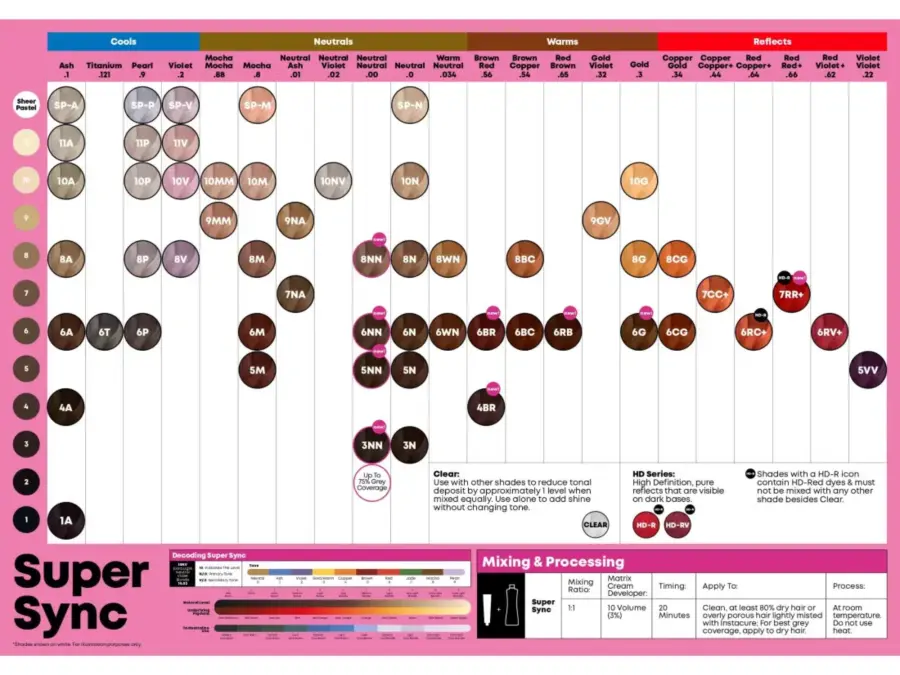 Míchací poměr: 1:1 Super Sync + 10 VOL (3 %) Matrix Cream Developer