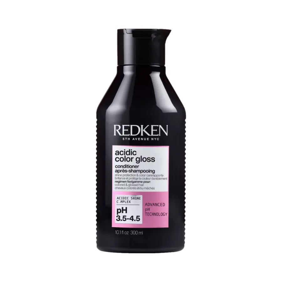 Kondicionér Redken Acidic Color Gloss obnovuje lesk a intenzitu barvených vlasů díky kyselému pH komplexu, který uzavírá vlasové kutikuly.